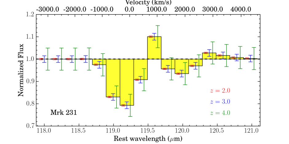 The nature of feedback on all scales is one of the key open questions in Astrophysics today, and a main goal of Origins is to characterize galactic feedback over cosmic time and across the spectrum of galaxies and environments over which it occurs. With Origins we can detect dense molecular gas currently outflowing from the centers of active galaxies, as well as the faint, diffuse gas and dust carried out from galaxies by powerful winds in the past. Origins will sample thousands of galaxies to z~4, detecting blueshifted absorption lines from transitions of OH and H20 in the far-infrared. At left is a simulated OST/OSS 1hr spectrum of the powerful molecular outflow in Mrk 231, as seen at z=2, 3, and 4. These fast, strong winds will be easily measured well past the peak in the galactic star formation rate density (SFRD), allowing us to sample feedback at the peak SFRD at z~2 and its role in quenching galaxies at later times. These broad wavelength coverage, unprecedented depths and large un-biased galaxy samples studied with a combination of fast spectral mapping, and deep follow-up spectroscopy, will enable sensitive tests of models of the chemical enrichment of the IGM and the baryon cycle in galaxies. Simulation courtesy of A. Gowardhan (Cornell).