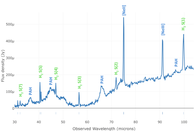 Origins will easily be able to identify galaxies with strong shocks from feedback directly from their infrared emission line spectra. At right is a simulated ULIRG at z=5 observed with OST/OSS in a 1hr integration. This galaxy has strong H2 emission lines (green), similar to what is seen in the nearby ULIRG, NGC 6240. These types of spectra are signposts for galaxies with feedback from supernovae and active nuclei, because the H2 lines from warm molecular gas are extremely bright when compared to the PAH features - much brighter than could be produced by young stars alone. In the planned OSS Deep survey, Origins will be able to quantify the numbers of such galaxies as a function of environment, luminosity and starburst and AGN power, providing the first unbiased census of feedback within the population of infrared galaxies into the epoch of reionization.